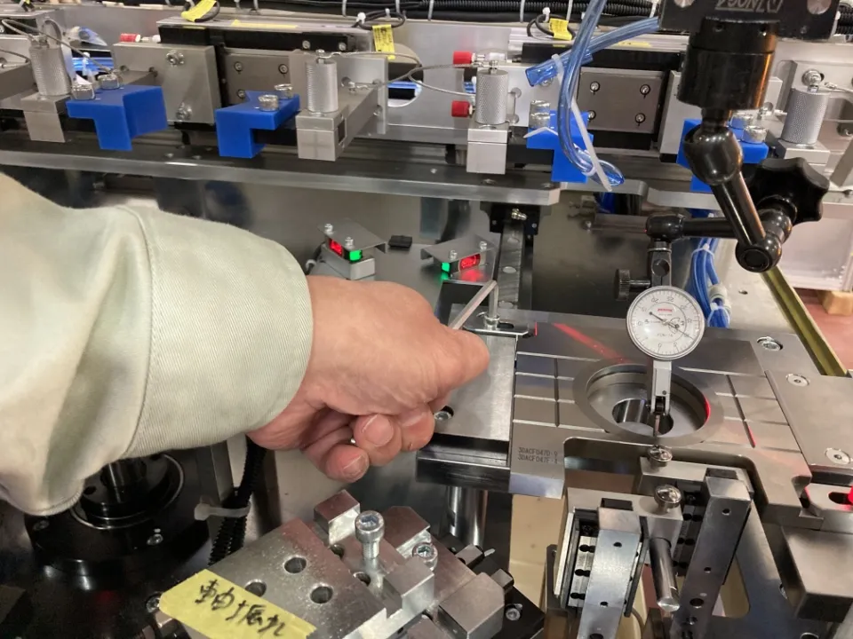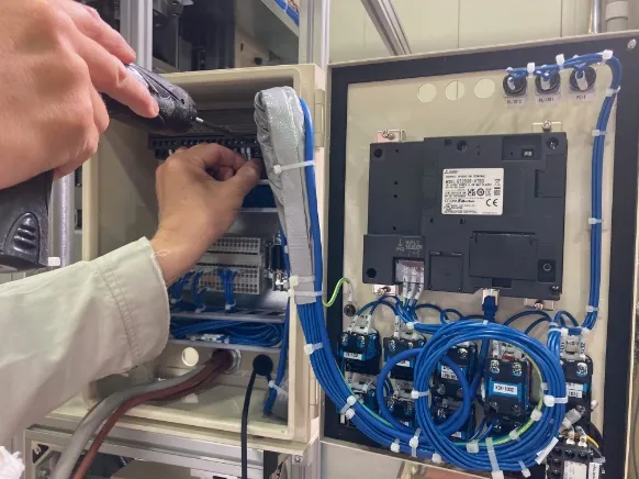 専用機が組み上がってきたら電気配線を行い、プログラムを入れて専用機にいのちを吹き込んでいく